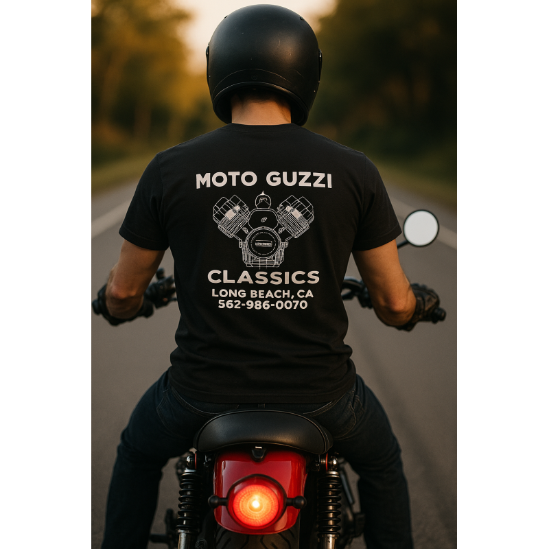 Rep the legend. This 100% cotton tee is true to size and built for comfort, whether youโ€™re wrenching in the garage or riding the coast. The front features the timeless Moto Guzzi Classics logo, while the back showcases a bold Guzzi engine graphic complete with our shopโ€™s logo, phone number, and Long Beach location. Clean, classic, and made for Guzzi fans who know the difference.